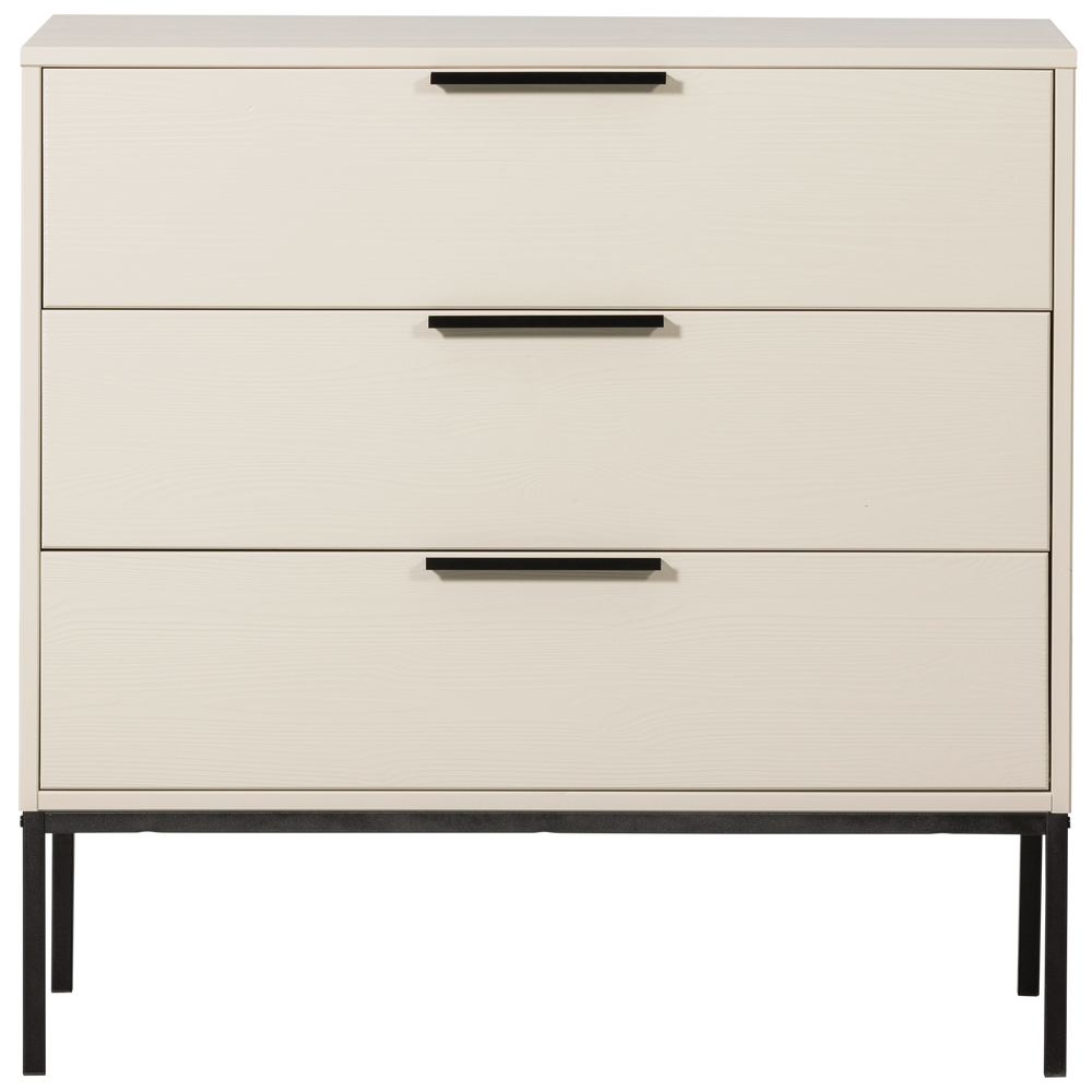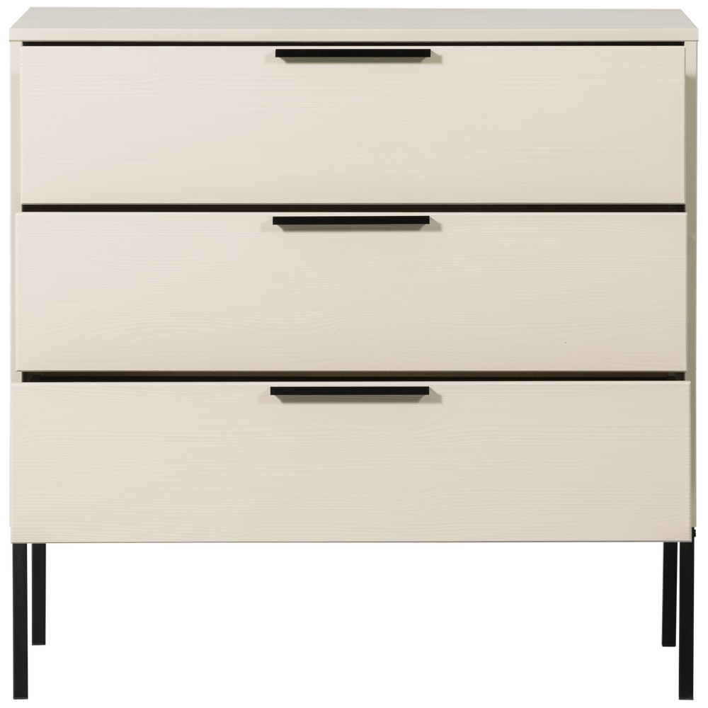 Een modern en clean design is wat deze ladekast kenmerkt. Deze ladekast komt uit de collectie van het Nederlandse interieurmerk WOOOD. Met maar liefst drie laden is er sprake van veel opbergruimte. De ladekast is gemaakt van massief geschuurd grenenhout wat een robuuste look geeft. Het onderstel en de handvaten zijn stijlvol afgewerkt met een mat zwarte poedercoating.