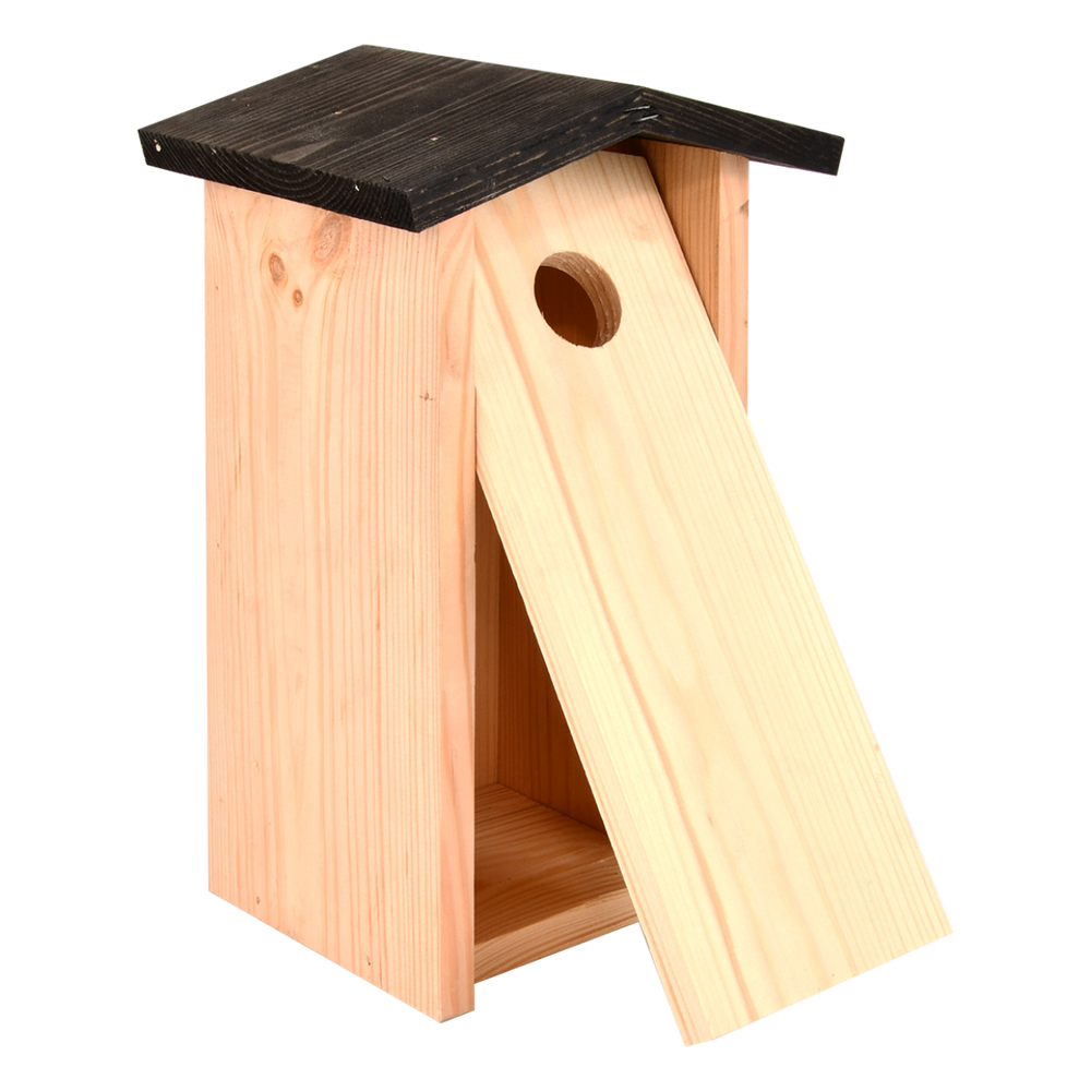 Deze eenvoudig vormgegeven nestkast met zwarte dakafwerking is geschikt voor de koolmees. Naast de koolmees kun je in deze kast ook de ringmus, huismus en pimpelmees als bewoner verwachten. In de winter wordt de nestkast vaak gebruikt als schuilplaats tegen het slechte weer.
