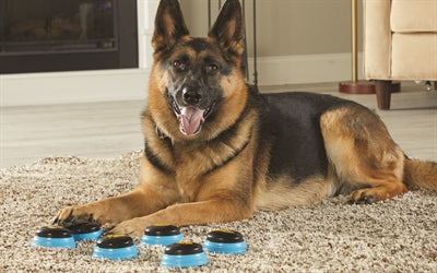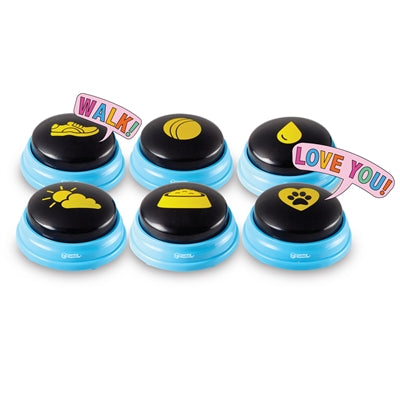 Met de Hunger For Words Talking Pet Essential Words Set kan jij jouw hond leren praten met de handige, zelf inspreekbare buttons en instructieboekje. Hunger for Words is opgericht door Christina Hunger, een logopediste die in haar puppy Stella een hoop kenmerken terugzag die ze ook ziet bij peuters vlak voor ze gaan praten. In de speech buttons van Hunger for Words wordt dierenpsychologie, spraakpathologie en AAC (Augmentative and Alternative Communication) gecombineerd tot een leerzaam en leuk spel waarin de hond leert zijn of haar stem te laten horen. De Essential Words Set biedt verschillende vooraf ingesproken woorden. Deze woorden komen terug in de basistraining van elke hond. Enorm handig dus! De buttons zijn Engels ingesproken en laten de woorden “walk ‘, “play”, “eat”, “outside”, “water” en “love you” horen. Bij deze set zit een handleiding geschreven door oprichtster inbegrepen