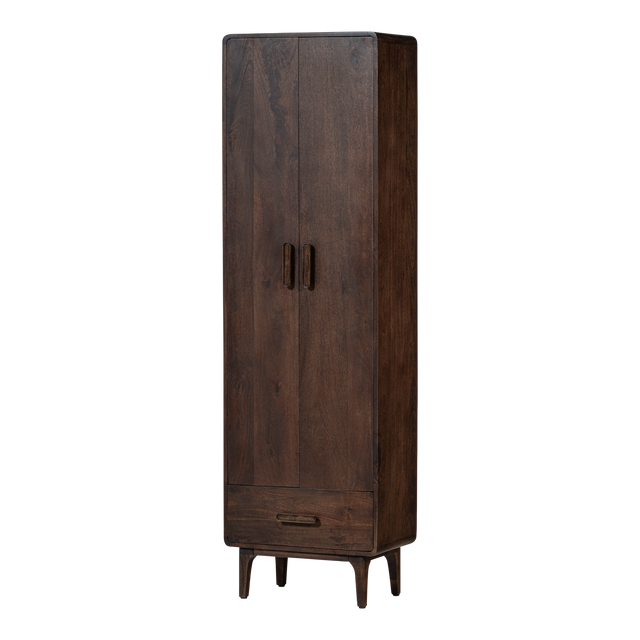 De kast is vervaardigd van mangohout, een materiaal dat bekend staat om zijn sterkte en natuurlijke uitstraling. Het mangohout heeft een warme, diepe donkerbruine kleur die karakter toevoegt aan jouw ruimte. De zichtbare nerf en houttekening maken elk meubel uniek en zorgen voor een authentieke, natuurlijke look die het interieur een persoonlijke touch geeft.