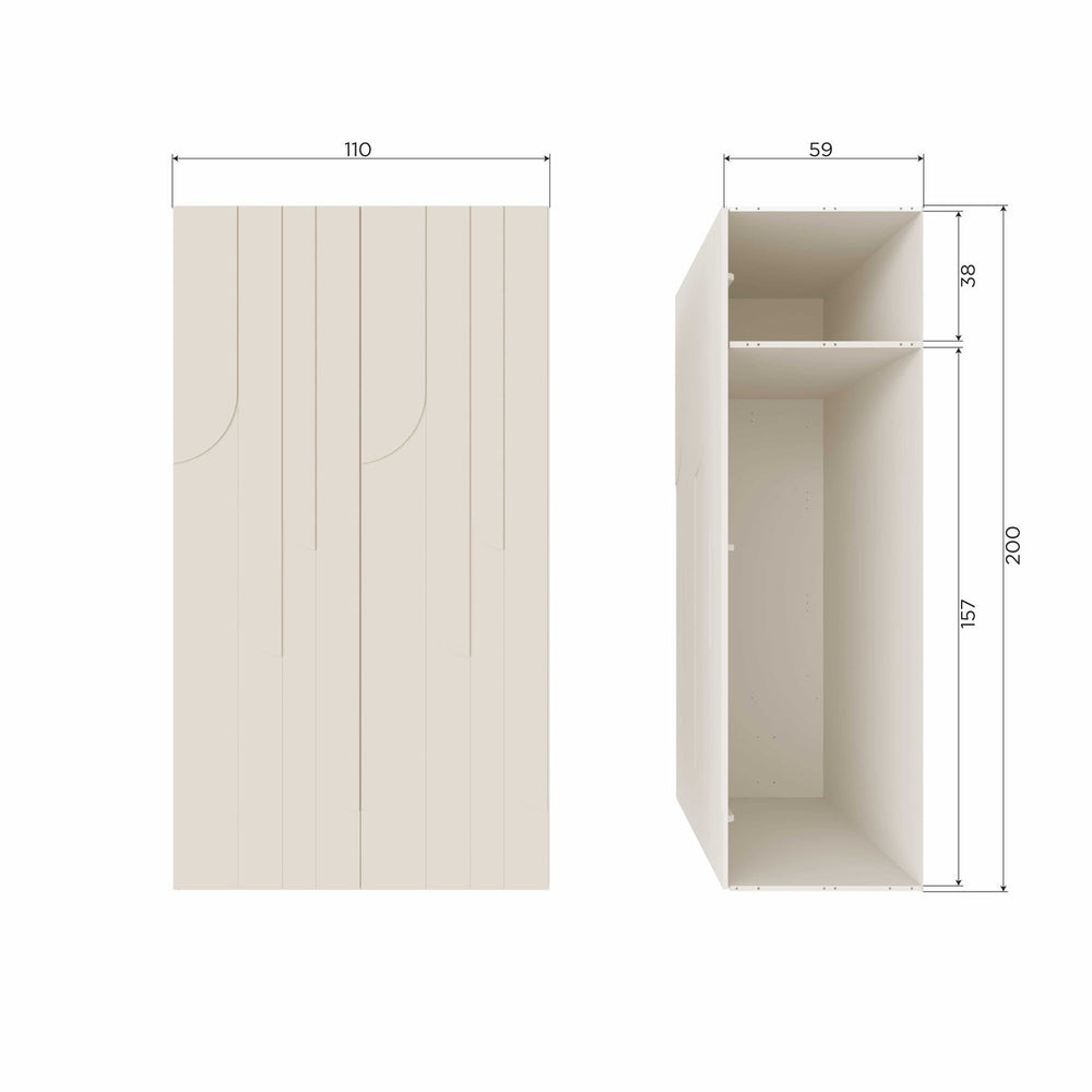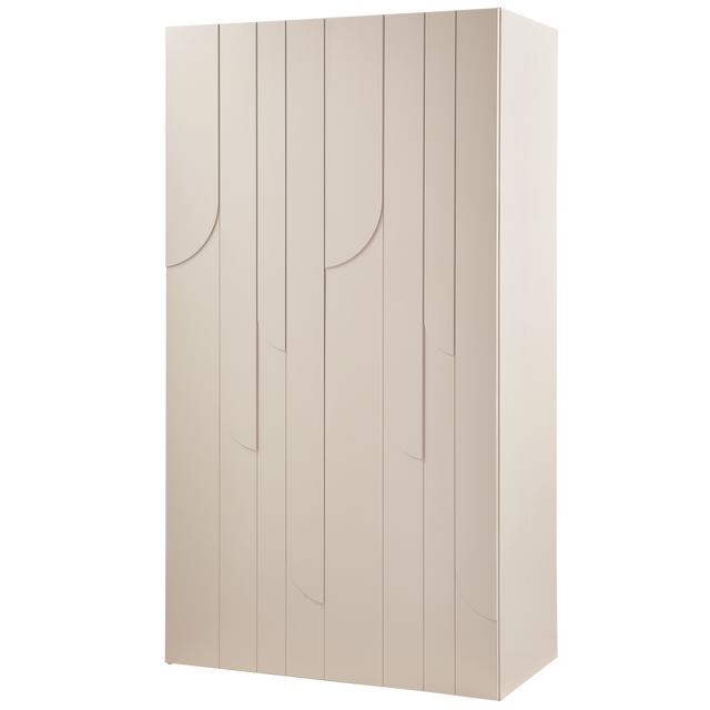 Het golvende patroon van regendruppels die langs de ramen naar beneden stromen. Dat is de inspiratiebron geweest voor het houtsnijwerk op de deuren van deze Rain 2-deurs kledingkast uit de collectie van het Nederlandse interieurmerk WOOOD. De dust kleurige afwerking houdt het ontwerp stijlvol en modern.