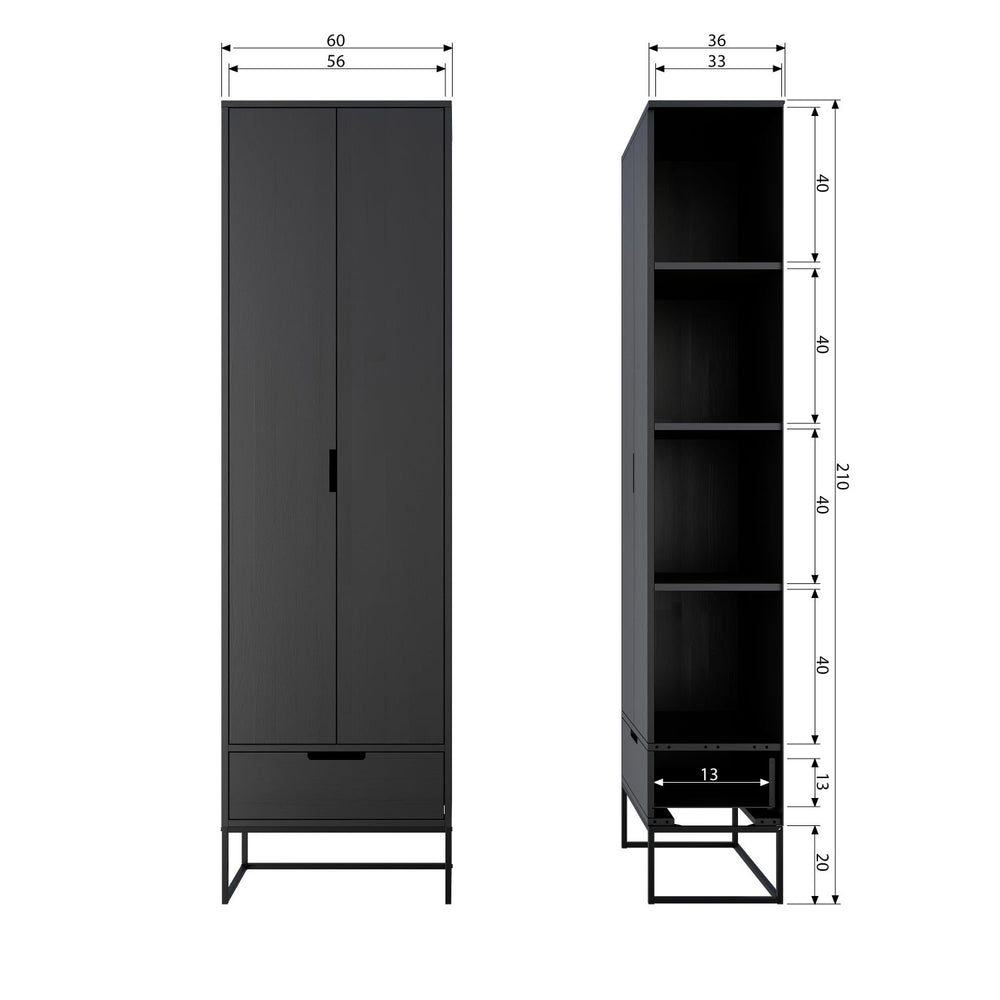 De Silas hoge kast heeft een hoogte van 210 cm, een breedte van 60 cm en een diepte van 36 cm. Achter de twee deuren zitten vier legplanken, de hoogte van de opbergvakken is 40 cm en de breedte is 56 cm. De diepte van de lade is 31 cm en de breedte 56 cm. Dit meubel heeft een gewicht van 37 kg.