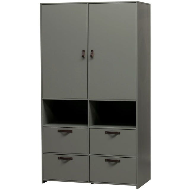 Deze Stage garderobekast uit de collectie van het Nederlandse merk vtwonen is modern en praktisch en heeft een stoere look. De kast is gemaakt van massief, FSC gecertificeerd, grenenhout gelakt in een groene soap tint en is voorzien van bruin leren greepjes. De twee open vakken ( H 26 cm) in de kast zorgen voor wat speelsheid.