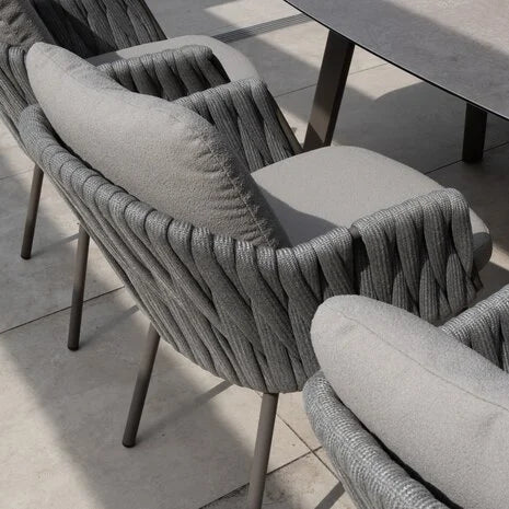 De Cannes dining stoel heeft een verfijnd en eigentijds ontwerp dat moeiteloos aansluit bij uiteenlopende tuin- en terrasstijlen. Het frame is gemaakt van gepoedercoat aluminium in de kleur terre, een warme en moderne tint die rust en elegantie uitstraalt. Rondom de rugleuning en armleuningen is de stoel afgewerkt met een prachtig gevlochten rope in een stijlvolle grijze kleur. Deze combinatie van kleuren en materialen geeft de Cannes stoel een uitnodigende, natuurlijke uitstraling die perfect past in elke buitenomgeving.